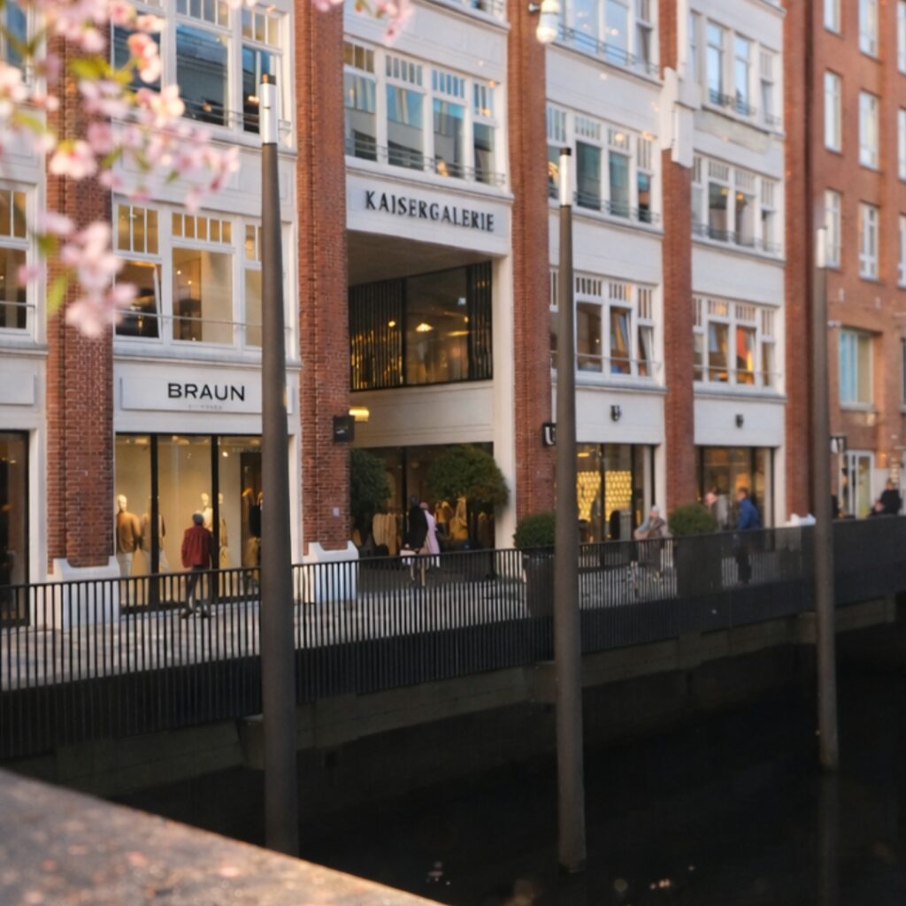 Der Fleetsteg der Kaisergalerie ist einer der wenigen Orte in der City, an denen man dem Wasser wirklich nah ist. Es ist ein Logenplatz ohne Allüren. Hier am Geländer zu stehen, bedeutet, die Stadt für einen Moment aus der Distanz zu betrachten. Die Blickachse zwischen den Großen Bleichen und dem Bleichenfleet schafft eine Weite, die man mitten im Passagenviertel kaum vermutet. Ob für einen kurzen Stopp zwischen zwei Terminen oder nach dem Besuch bei GÄRTNER oder BRAUN Hamburg – dieser Steg ist der stille Ankerpunkt des Hauses. Hanseatisches Understatement in Bestform.
